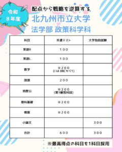 そんな北九州市立大学 法学部 政策科学科を志望している方はぜひお問い合わせください!