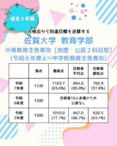 佐賀大学 教育学部 小中連携教育コース 中学校教育主免専攻[地歴・公民2科目型]。