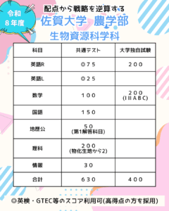 佐賀大学は共テ英語の点数を英検等のスコアで置き換えることができますが、農学部の場合は置き換えたとしても100点。そして2次で200点満点の英語。